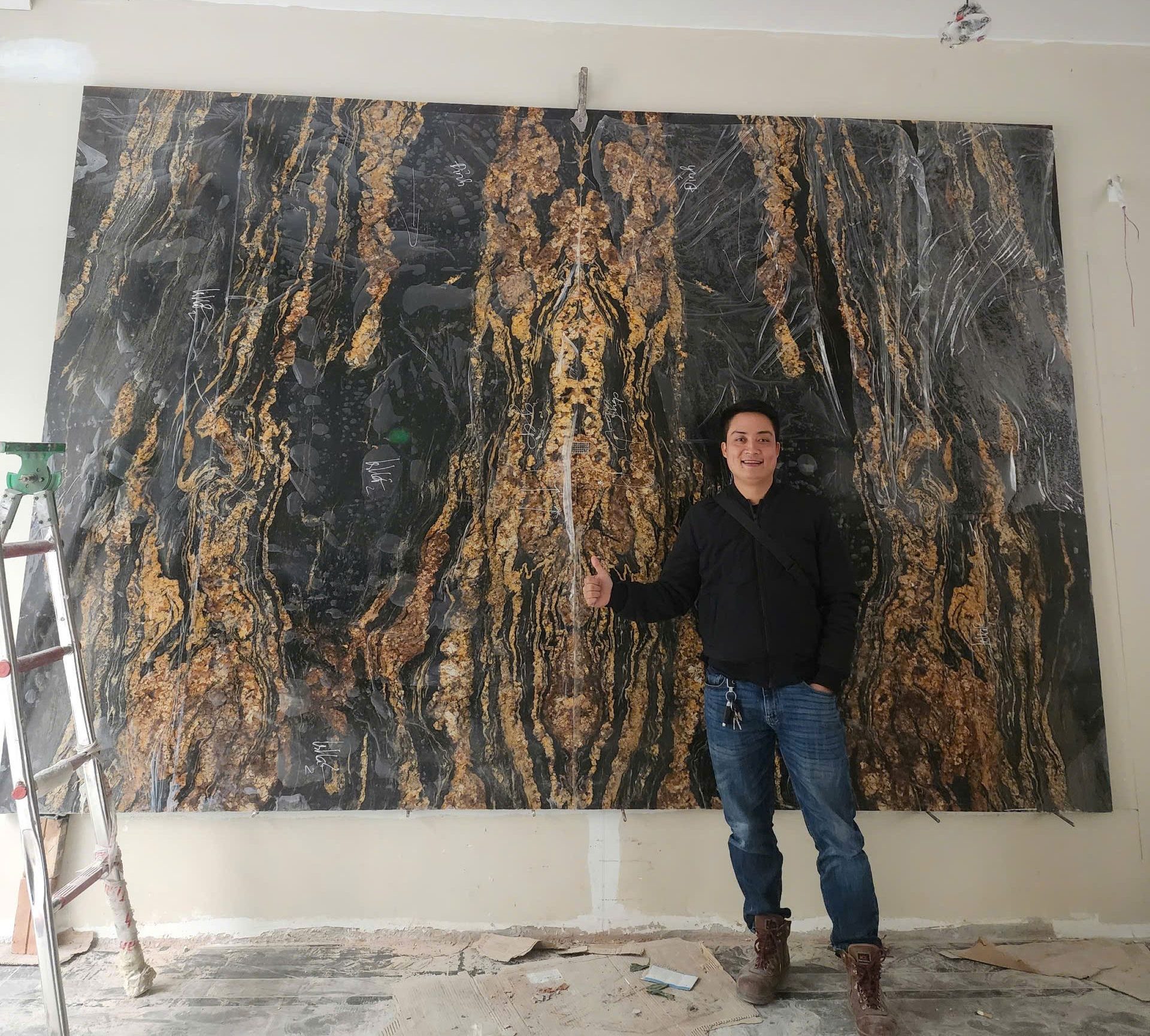 - Thiết kế đối xứng: Sử dụng 2 tấm đá lớn kích thước 333 x 200 cm, ghép đối xứng hoàn hảo để tạo nên hiệu ứng thị giác ấn tượng.